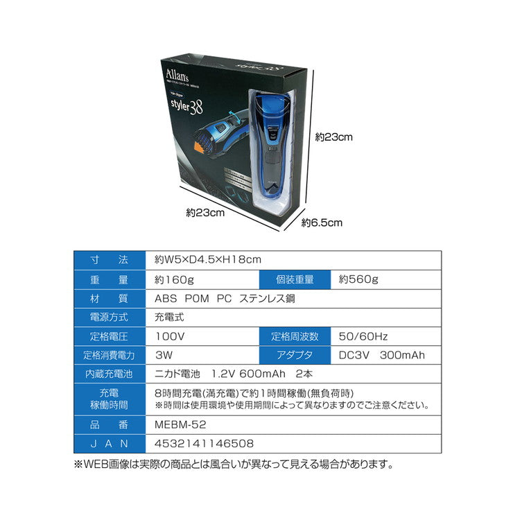 充電式 バリカンスタイラー 38段階式 アタッチメント付き 水洗い可 バリカン ヘアバリカン コードレス MEBM-52 ヘアスタイル
