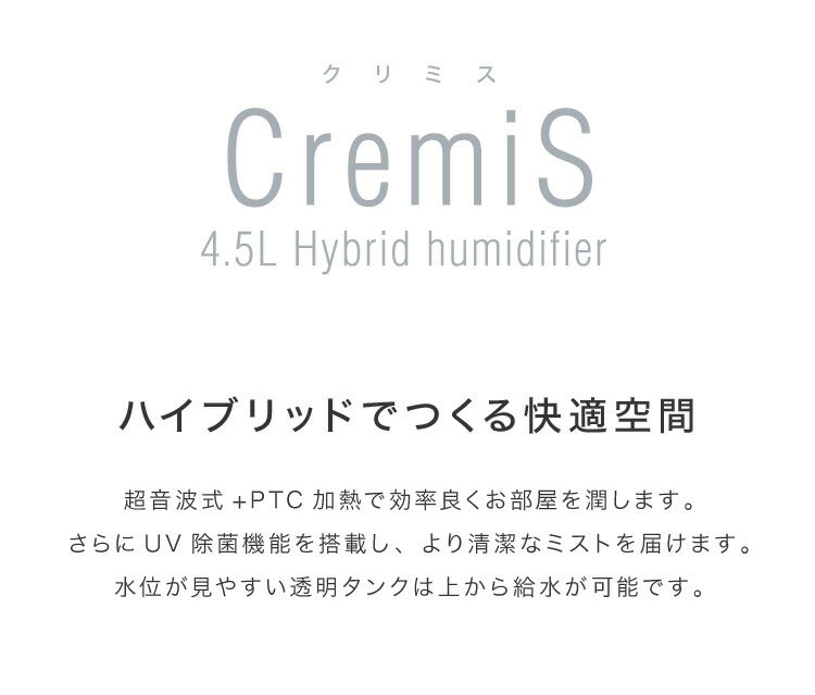 4.5L ハイブリッド加湿器 上部吸水 UV UV除菌 オートオフ タイマー ハイブリッド式 超音波式 加熱式 スチーム 透明タンク 加湿量3段階 小型 コンパクト クリミス MES-58