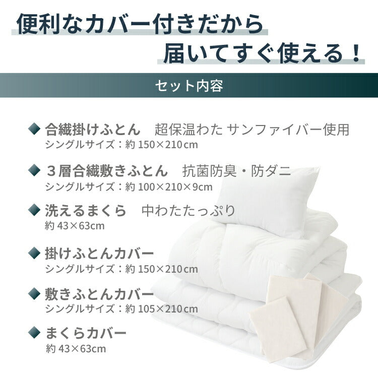 丸八真綿 寝具6点セット シングル 選べるカバー 洗える 抗菌 防臭 防ダニ 合繊 掛布団 敷布団 枕 カバー 保温 3層敷布団 サンファイバー 厚み9cm(代引不可)