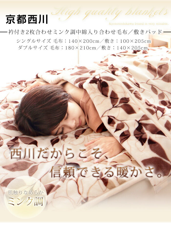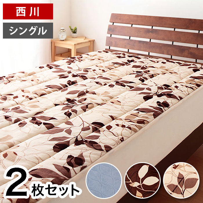 敷パッド 2枚組 シングル 京都西川 シングルサイズ 180×210 ミンク調 中綿入り フランネル モートンリーフ柄 水洗い可 おしゃれ シック あったか ブランケット ひざ掛け 膝掛け もうふ 布団