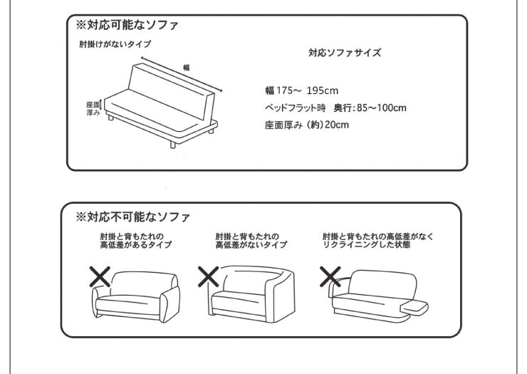 サイズ:幅(約)175~195cm、ベッドフラット時奥行(約)85~100cm、座面厚み(約)20cm