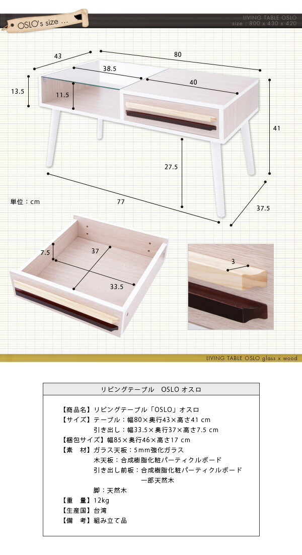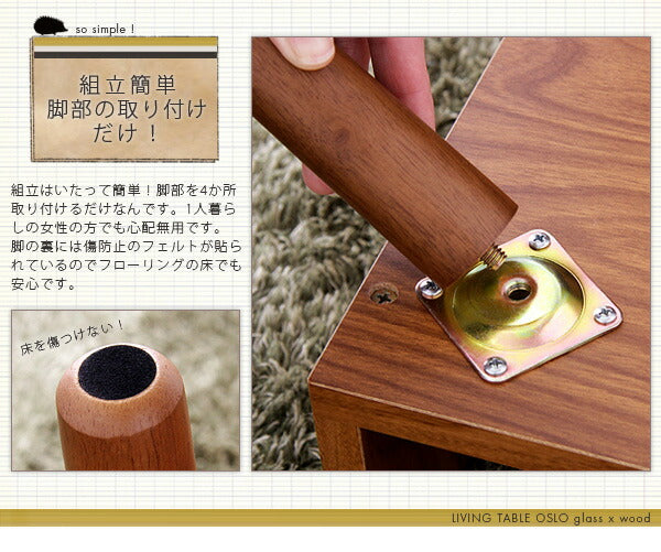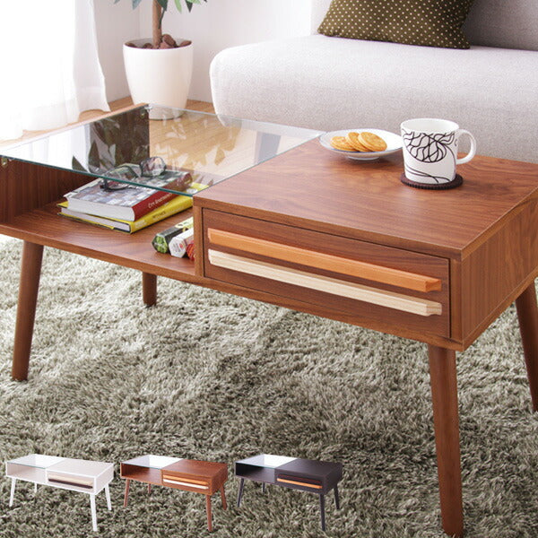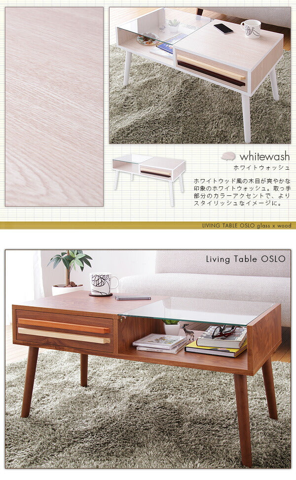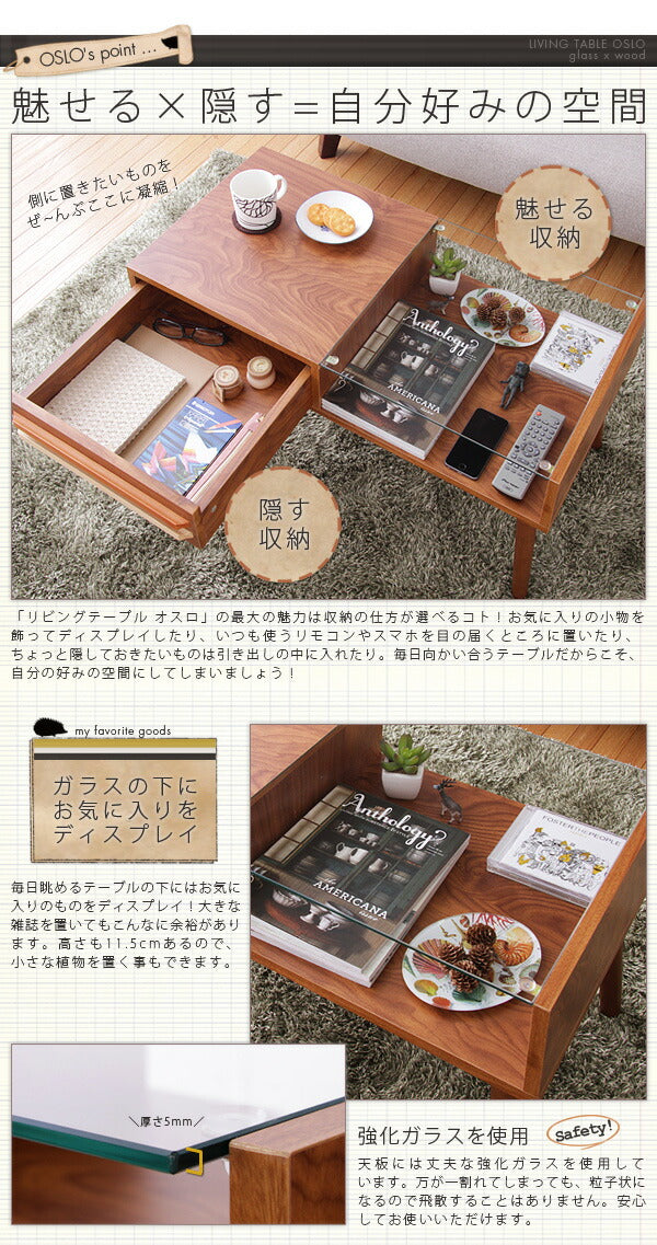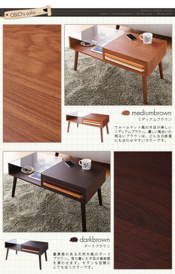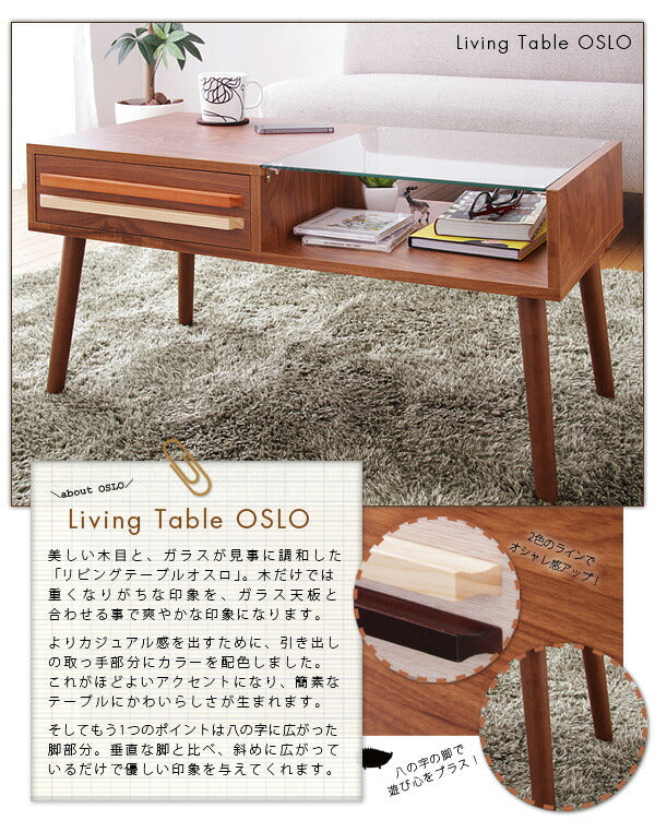 テーブル ウォールナット ガラス 木製 ローテーブル 引き出し 北欧 OSLO 【リビングテーブル オスロ】
