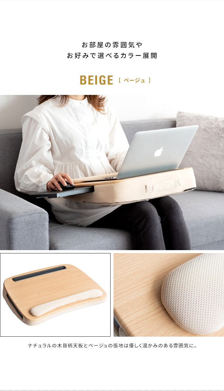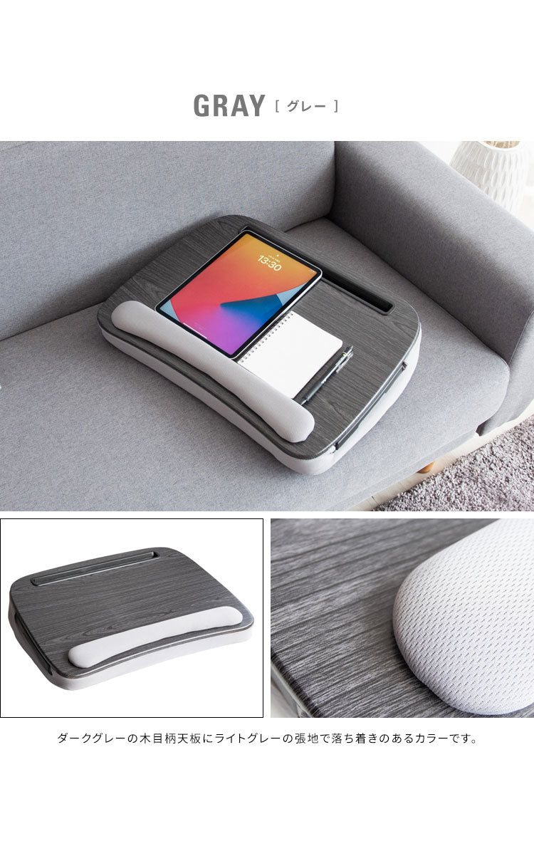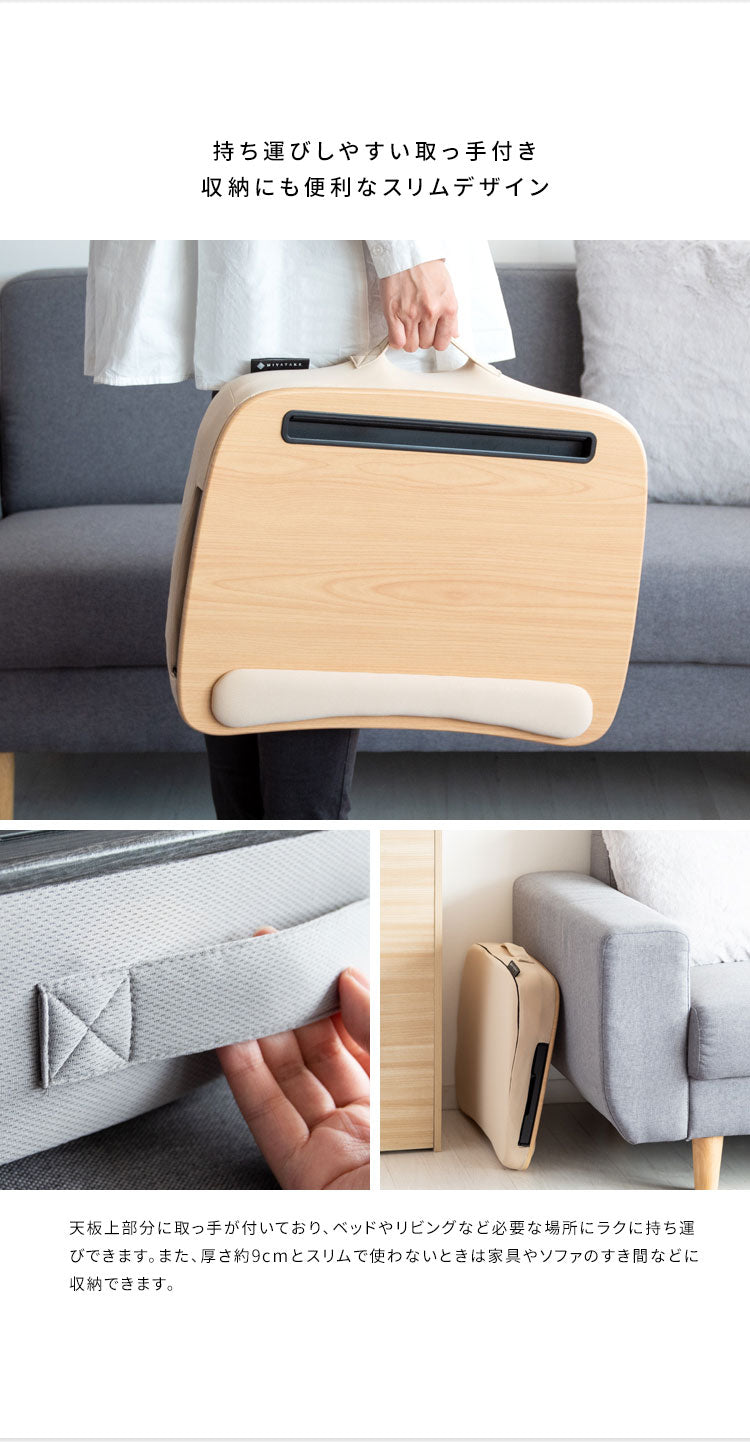 膝に乗せてノートパソコンやタブレットを乗せたり、本を読んだり、お食事を置いたり様々な用途にお使いいただけます。天板にはタブレットを立て掛けられるスタンドと、天板に置いたものの滑り止めにもなる手首の負担を軽減するリフトレストが付いております。クッションのサイドには左右どちらでも出せるスマホスタンド付きのマウストレーを内蔵。