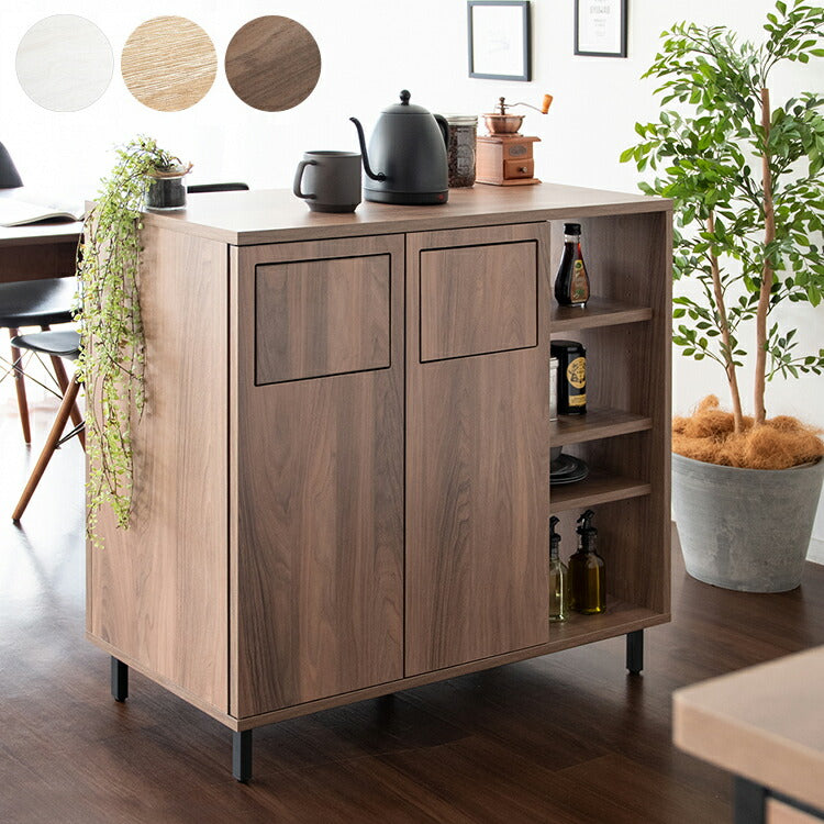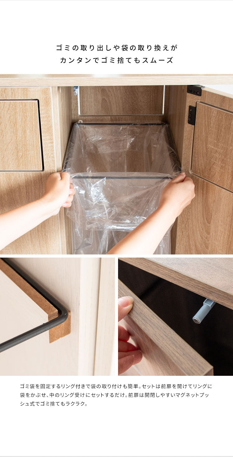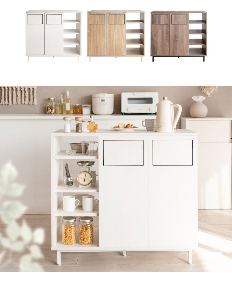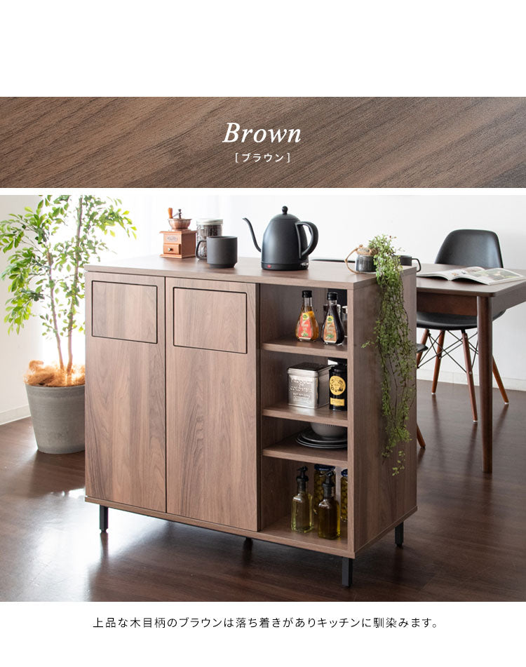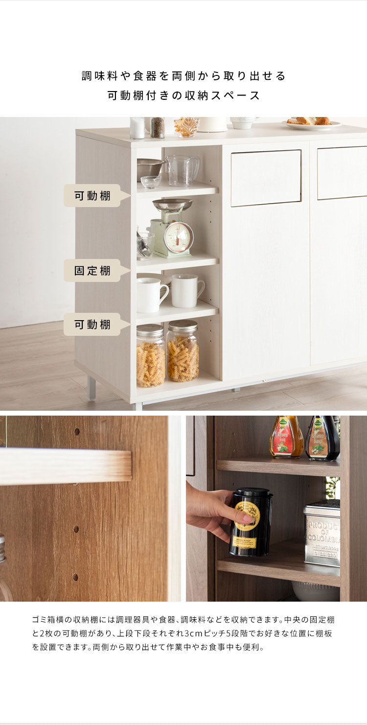 キッチン・ダイニングの両側にプッシュ扉があり、両方からゴミを分別して捨てられます。両側から取り出せる可動棚付きの棚は調味料や調理器具を収納できます。広々とした幅90cmと丁度良い高さ90cmの天板は調理スペースとしてお使いいただけます。リビングやキッチンとの間仕切りとしても便利。