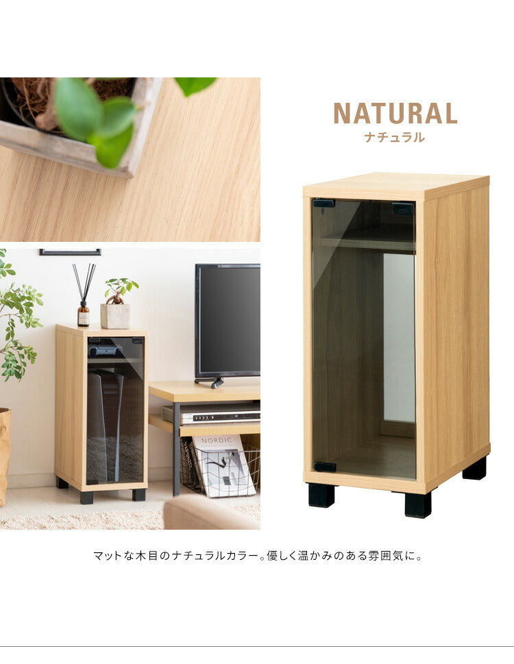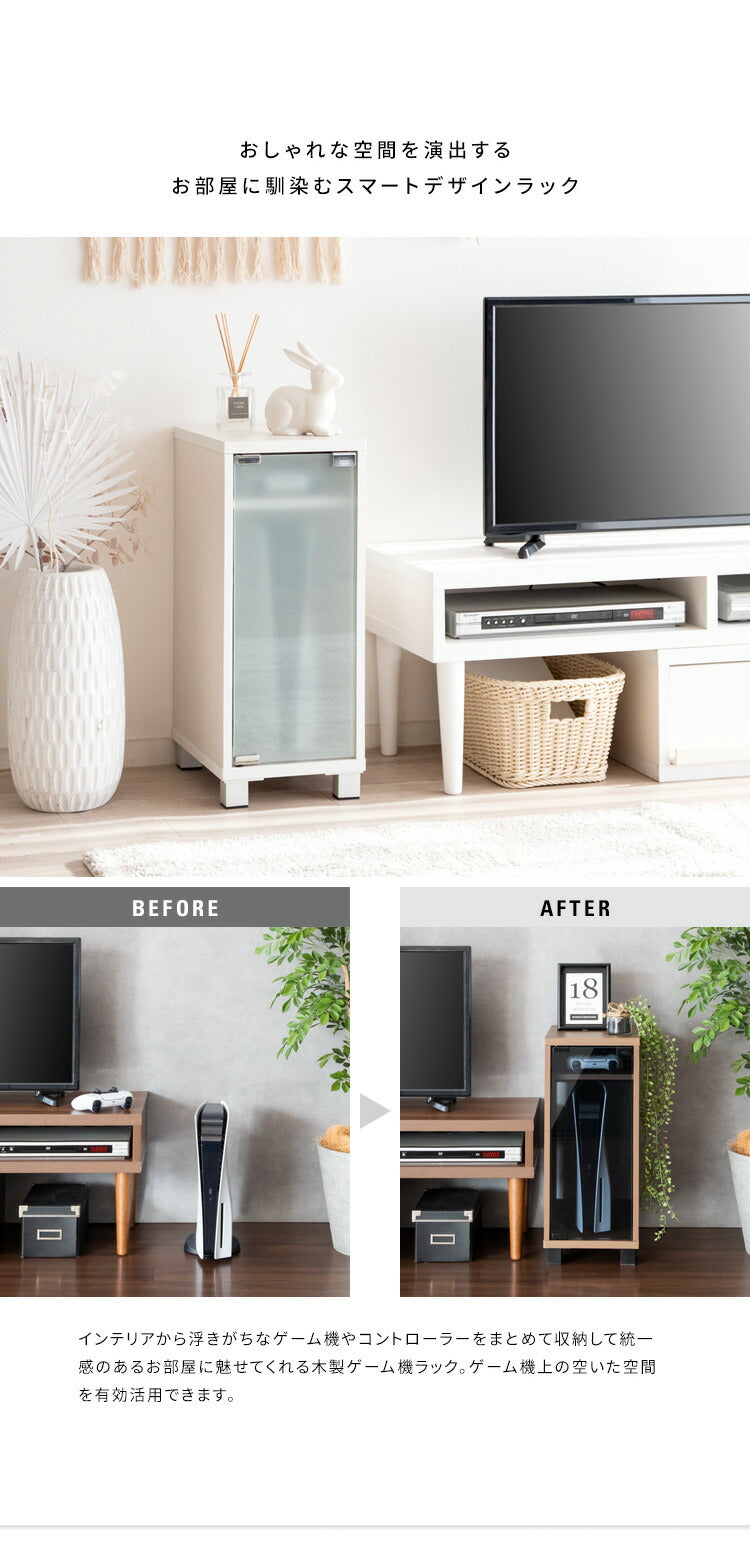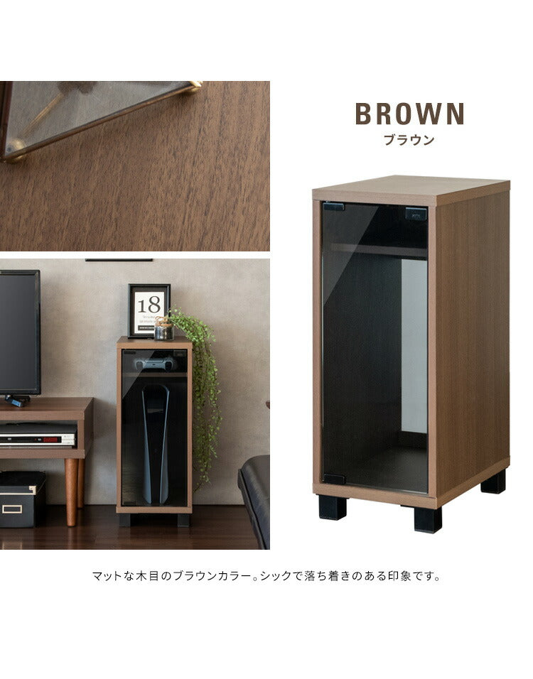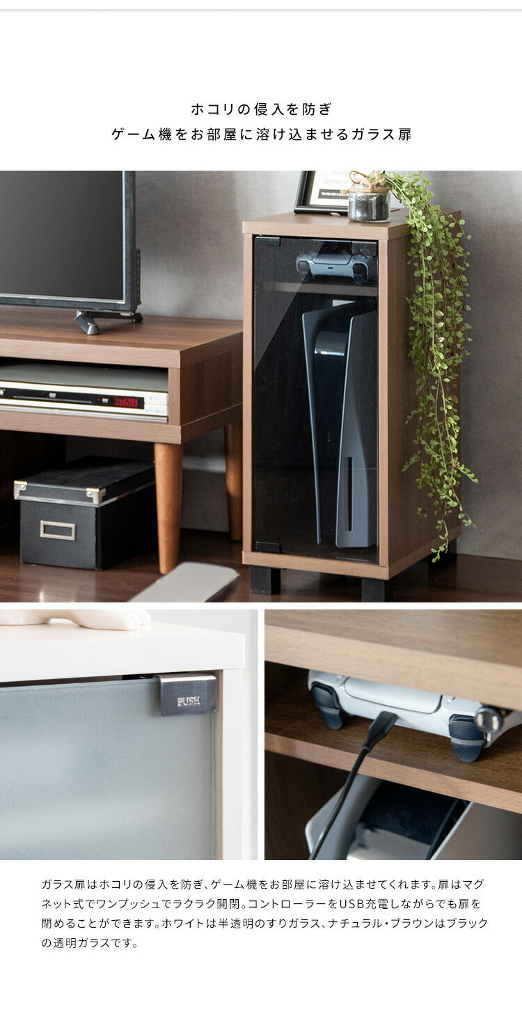 PS5など据置ゲーム機が縦にピッタリ収まるラックはガラス扉になっており、ゲーム機を隠してホコリの侵入を防ぎます。