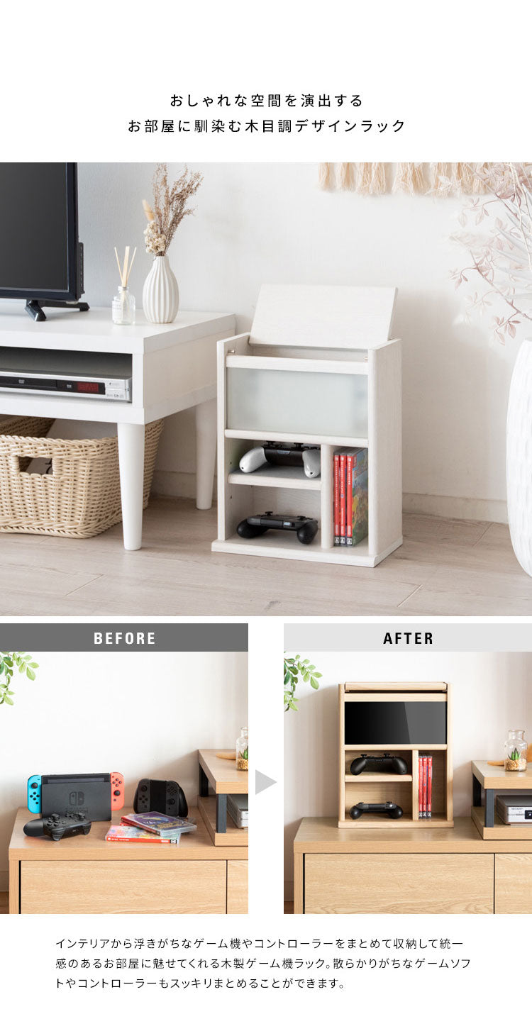 背面は放熱対策もできるオープン仕様。ゲームソフトやコントローラーが入る収納棚付きでSwitch周りをスッキリ。