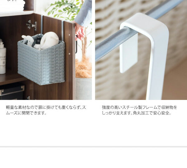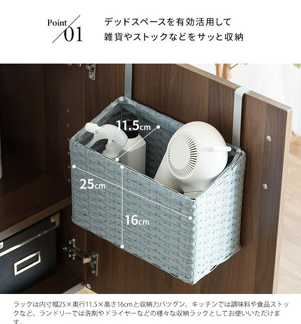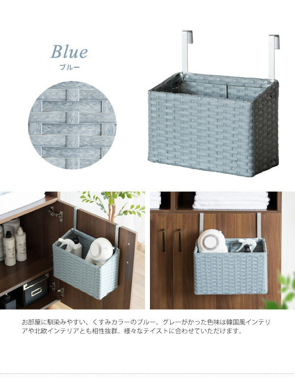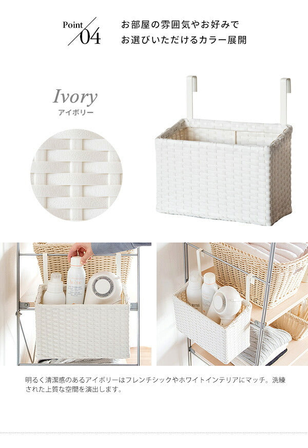 扉の内側やスチールラックの側面などのデッドスペースが、収納に早変わり。高さのあるボトルやドライヤーも入るサイズで収納力もバツグン。必要な時にすぐ取り出せます。素材は水に強く通気性のある樹脂製ラタンで水周りでも安心です。