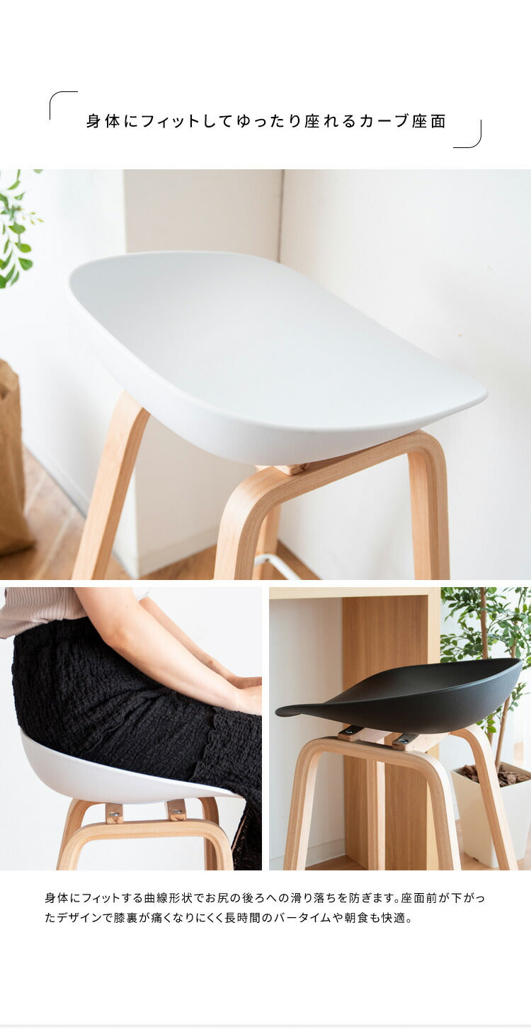 曲線を描いた座面は身体にフィットし、カフェやバータイムにリラックスしてお座りいただけます。温かみのある天然木脚はリラックスできる足置き付き。