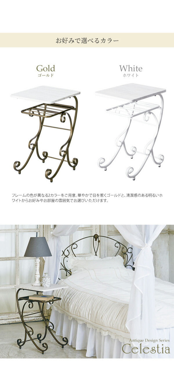 曲線をあしらった装飾の洗練されたデザイン、心地よさを醸し出すアンティークゴールドが人気の『Celestia(セレスティア)』シリーズのナイトテーブル。