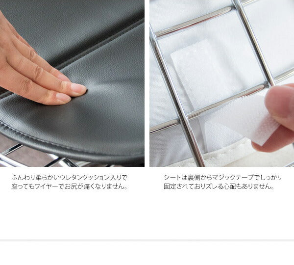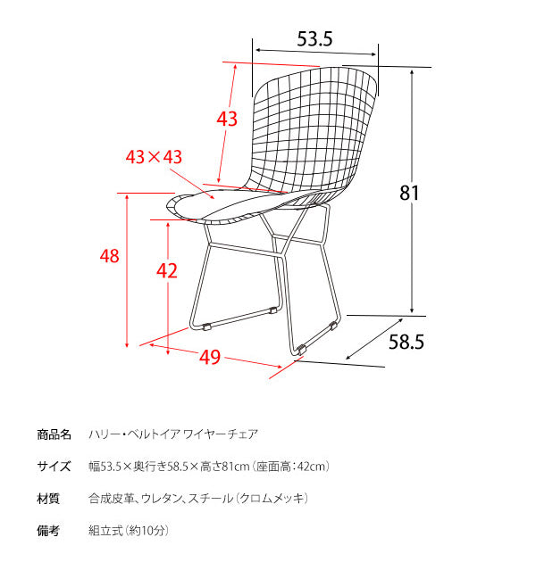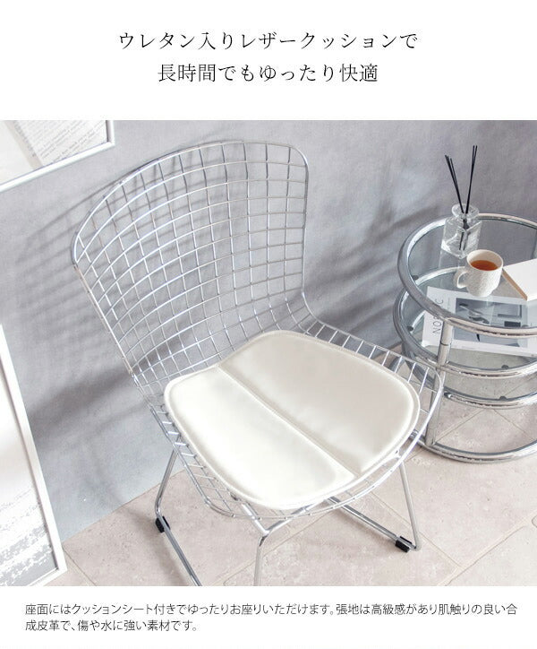 スチールのワイヤーが網目状に構成された背もたれは軽量かつ耐久性に優れております。広々とした座面はレザークッション付きでお尻が痛くなりにくく、くつろげるデザインです。