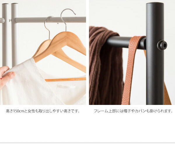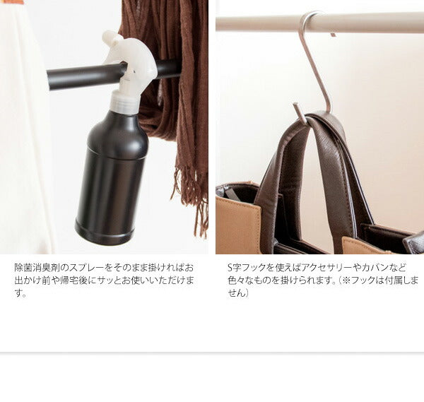 バーの位置は4段階でお好みの位置に取り付けられるのでボトムやカバンなどお気に入りを魅せながら収納できます。パーテーションタイプで使わないときは折りたたんでスリムに収納できるので来客時のコートハンガーや室内物干しにも最適。