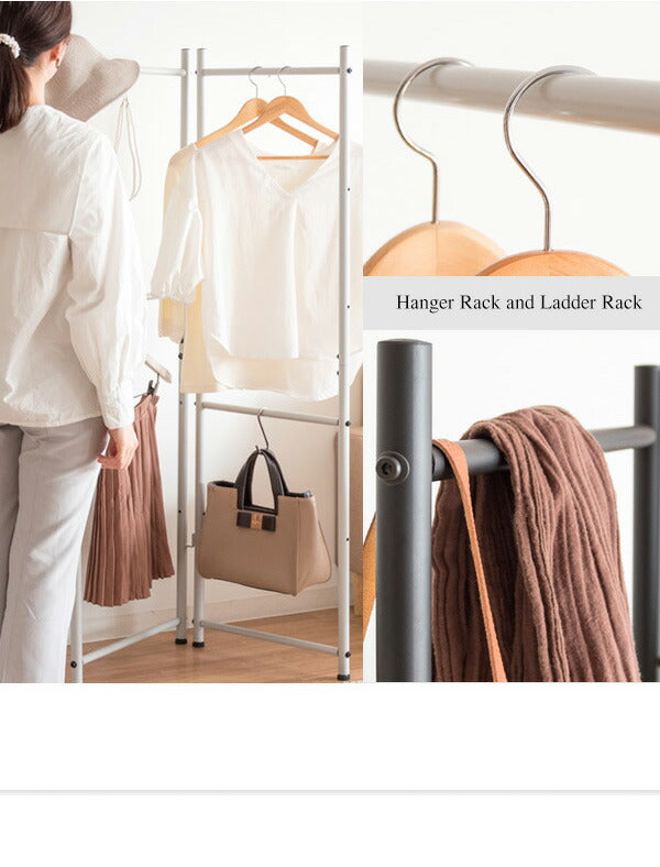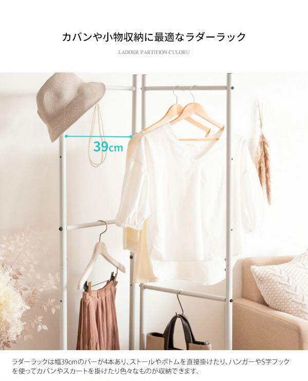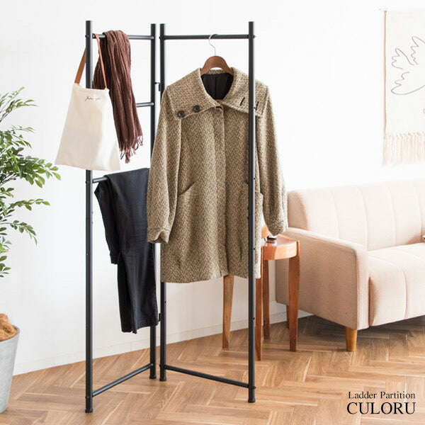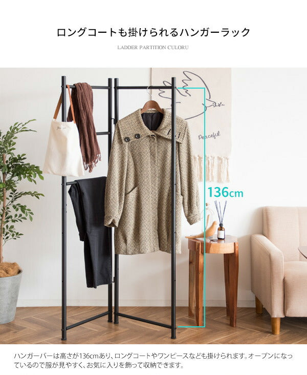 ロングコートやワンピースも収まる高さのハンガ―ラックとカバンやストールなどを掛けられるラダーラックが一つになった便利なラダーパーテーション『CULORU(クロル)』。
