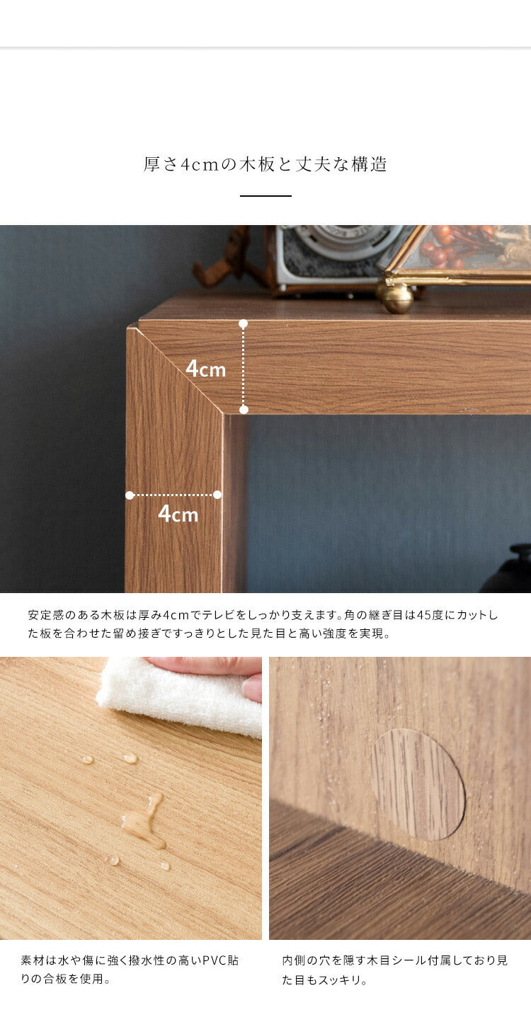 厚み4cmの頑丈な設計で大型テレビやゲーム機も安心して置けます。棚は可動式で収納するものの高さに合わせて調節可能。