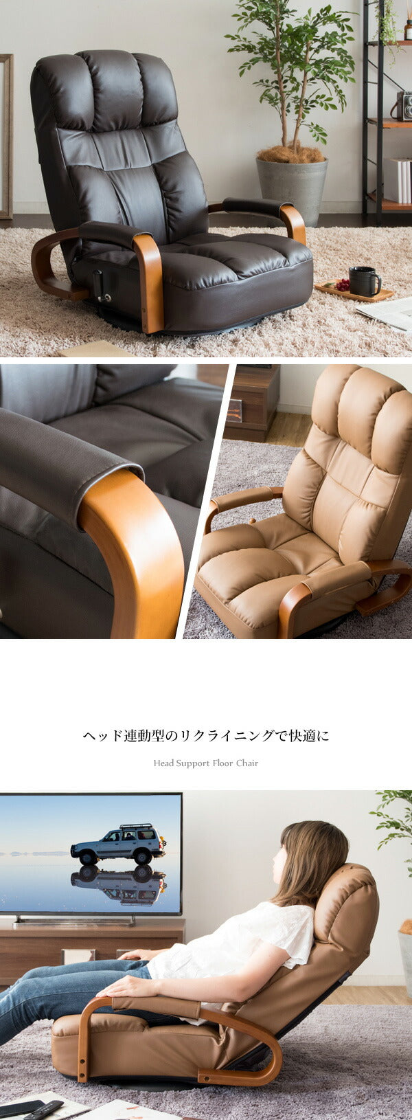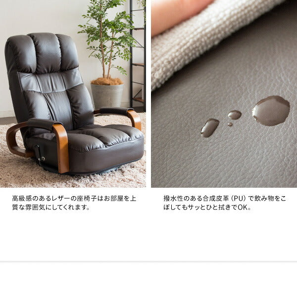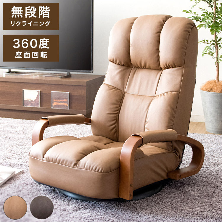 無段階リクライニングで、テレビ鑑賞やお昼寝などお好みの角度に調節してゆったりおくつろぎいただけます。カバー付きの丈夫な木肘や360度の回転盤で立ち座りもラクラク