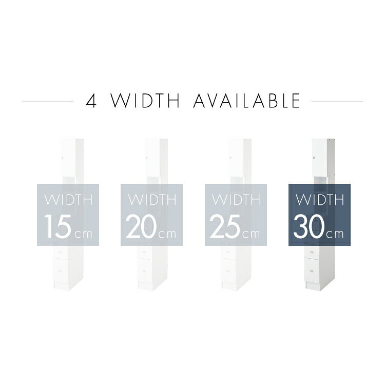 わずかなすき間にも設置できる、幅15cmから30cmまで4タイプ揃えたすき間収納シリーズ。
