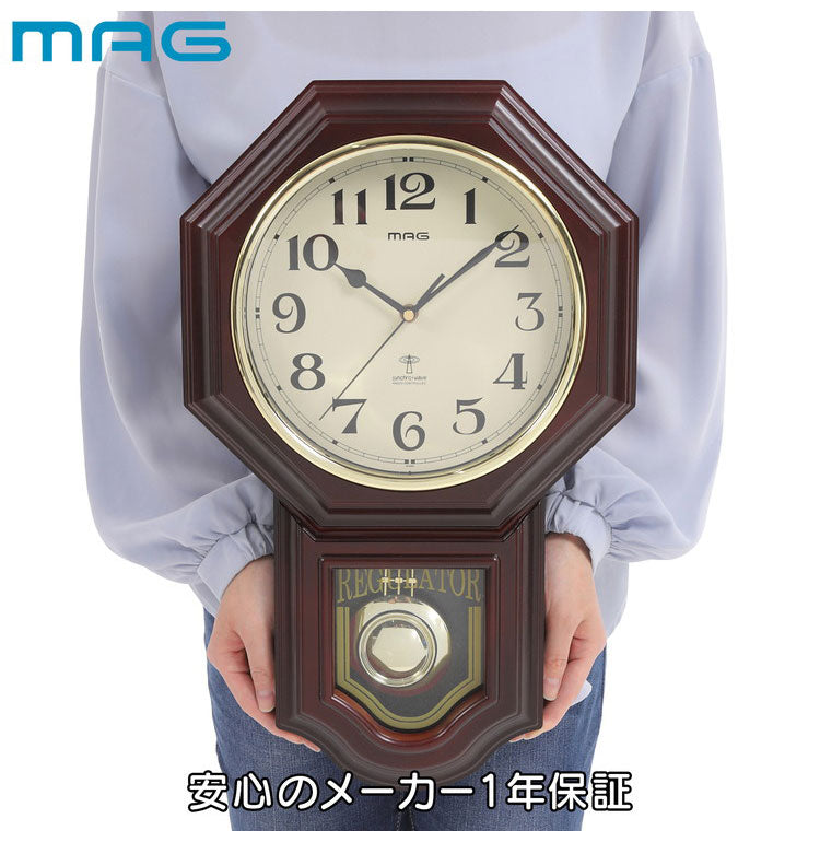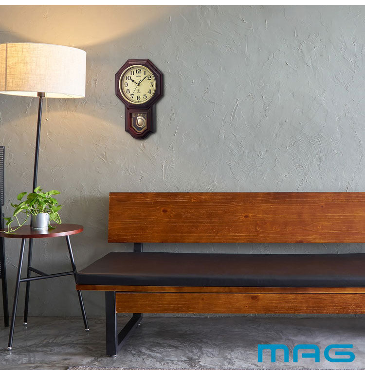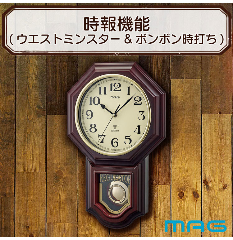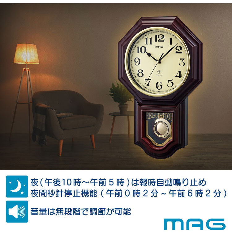 機能:連続秒針、報時機能(16曲メロディ&ボンボン時打ち)、音量無段階調節、夜間自動鳴止め(午後10時~午前5時)、振り子