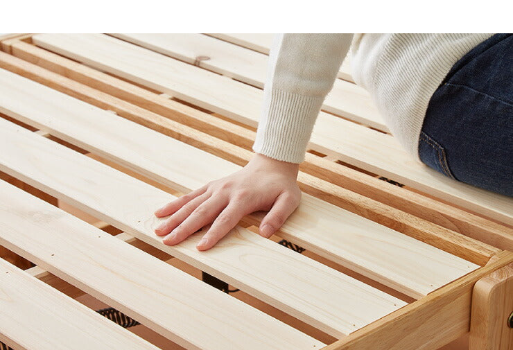 ベッドを広げた時には最下点の木部フレームよりもキャスターの最下点が若干浮くように設計しております。