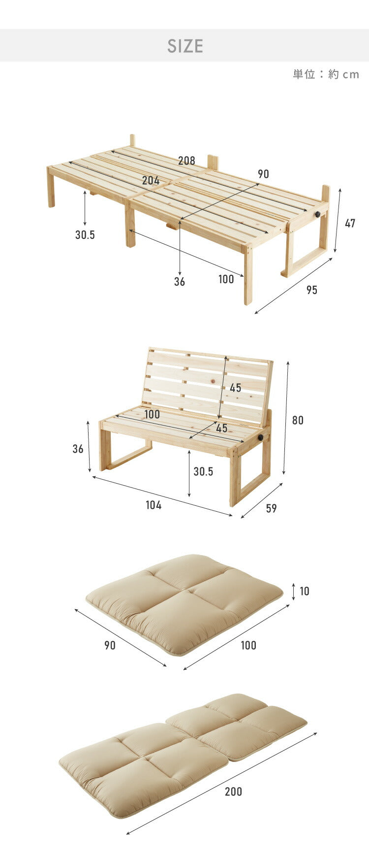 座面サイズ:幅90×長204×高36cm