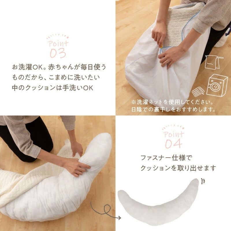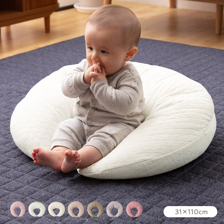 くもの形のキルト加工で、ぽこぽこ感がかわいい綿100%のマルチクッション。おすわりクッションや、授乳クッション、ホックを外せば抱き枕にと、マルチに活躍
