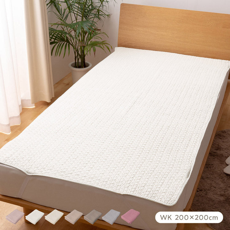 くもの形のキルト加工で、ぽこぽこ感がかわいい綿100%の敷きパッド。汗ばむ季節もさらっとした肌触りで快適。ゴムバンド付きでベッドにも敷布団にもOK。
