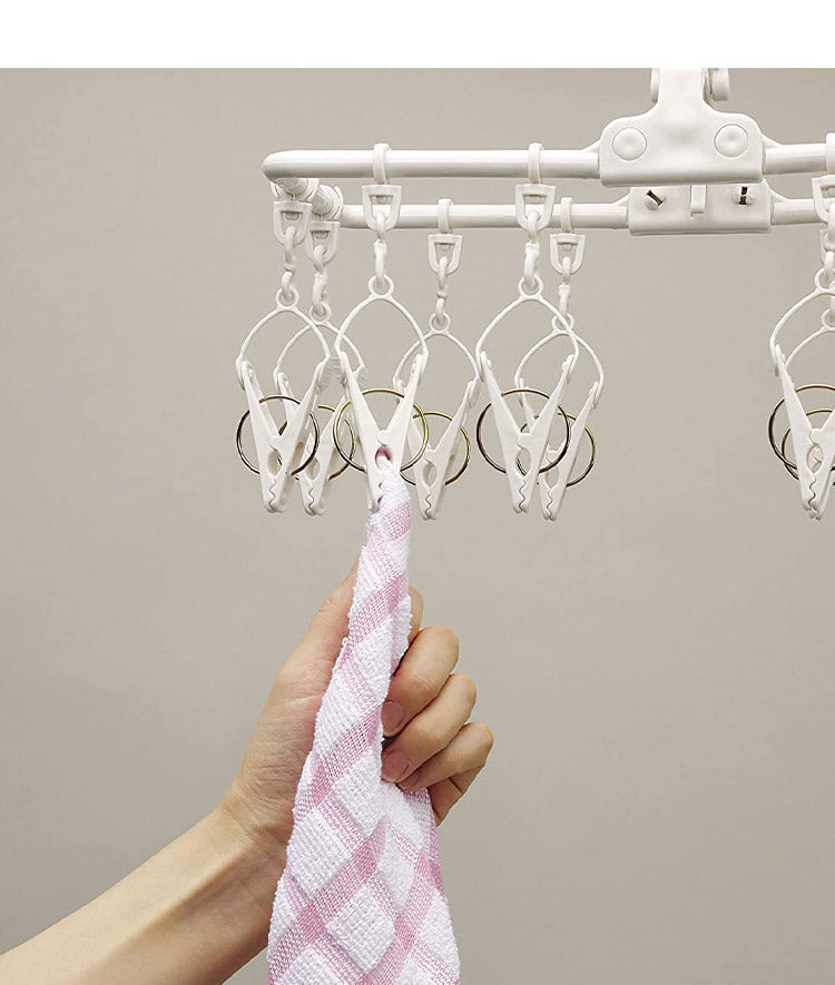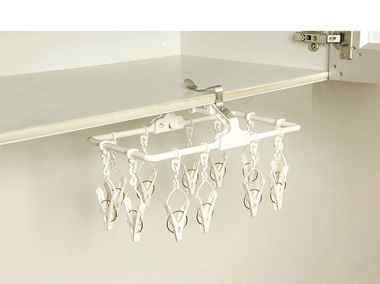 竿などにも掛けられるので外干しもできます。内蔵フックを使えばドアなどに掛けられ室内干しもできます