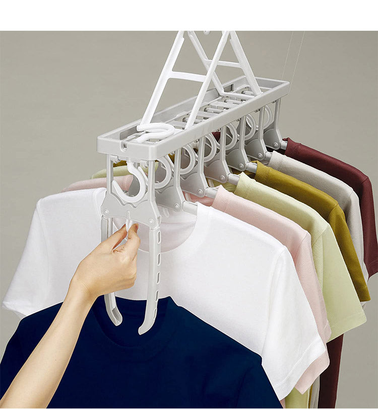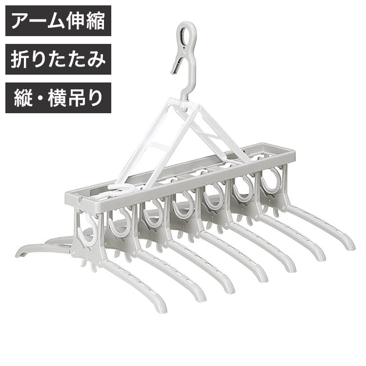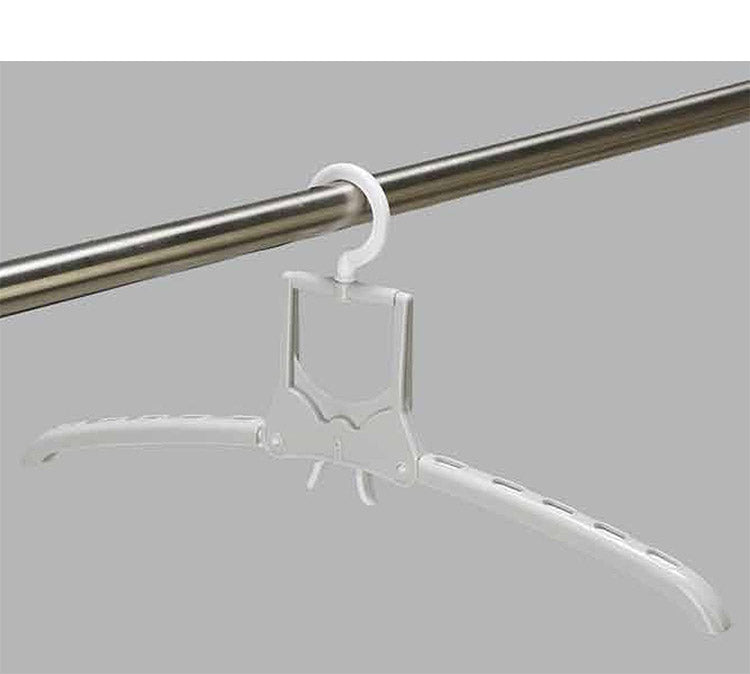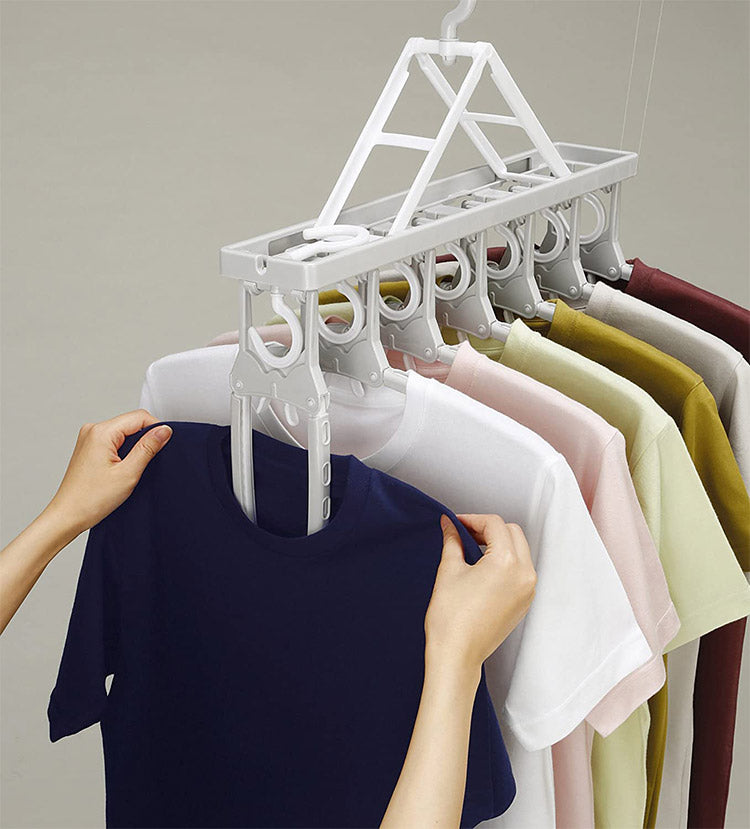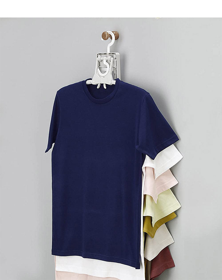 折りたたみ式のハンガーなのでTシャツなどの首元から差し込め、伸ばさずに簡単に干せます。取り入れもつまみをつまめばワンタッチで取り込めます