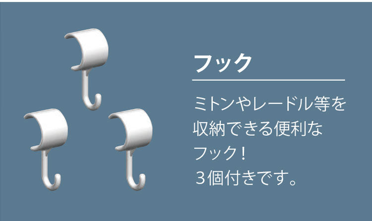 フック:ミトンやレードル等を掛けて収納できる便利なフック。3個付きです。