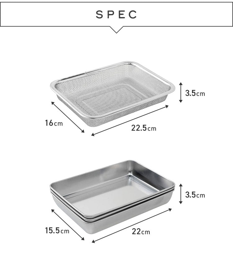 ・サイズ(約):バット/幅22×奥行 15.5×高さ 3.5cm(満水容量:900ml) 角型ザル/幅22.5×奥行 16×高さ 3.5cm フタ/幅 22.5×奥行 16×高さ 1cm