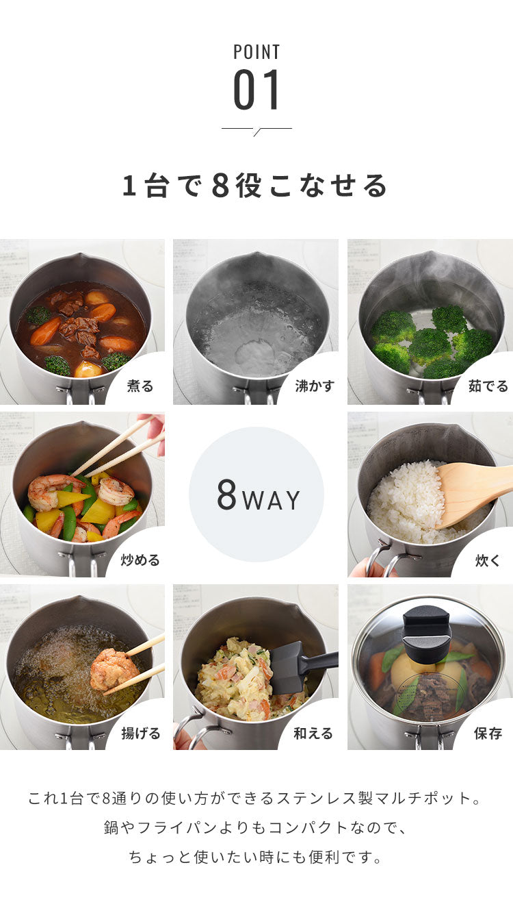 日本製 燕三条 ステンレスマルチポット 14cm 深型 ガラス蓋付き ガス火 IH対応 2.1L 逸品物創 ステンレス製 鍋 コンパクト スリム 片手鍋 揚げ鍋 天ぷら鍋 フライパン ミルクパン A-77839