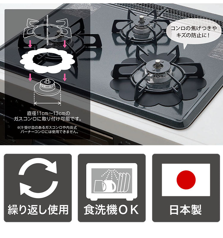 ガスコンロを使用している際の、油跳ねや吹きこぼれによるバーナー付近の汚れをガードします。