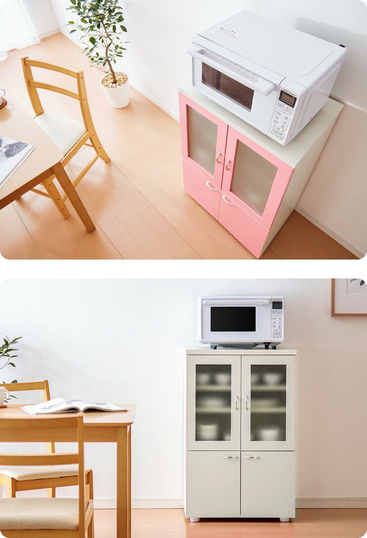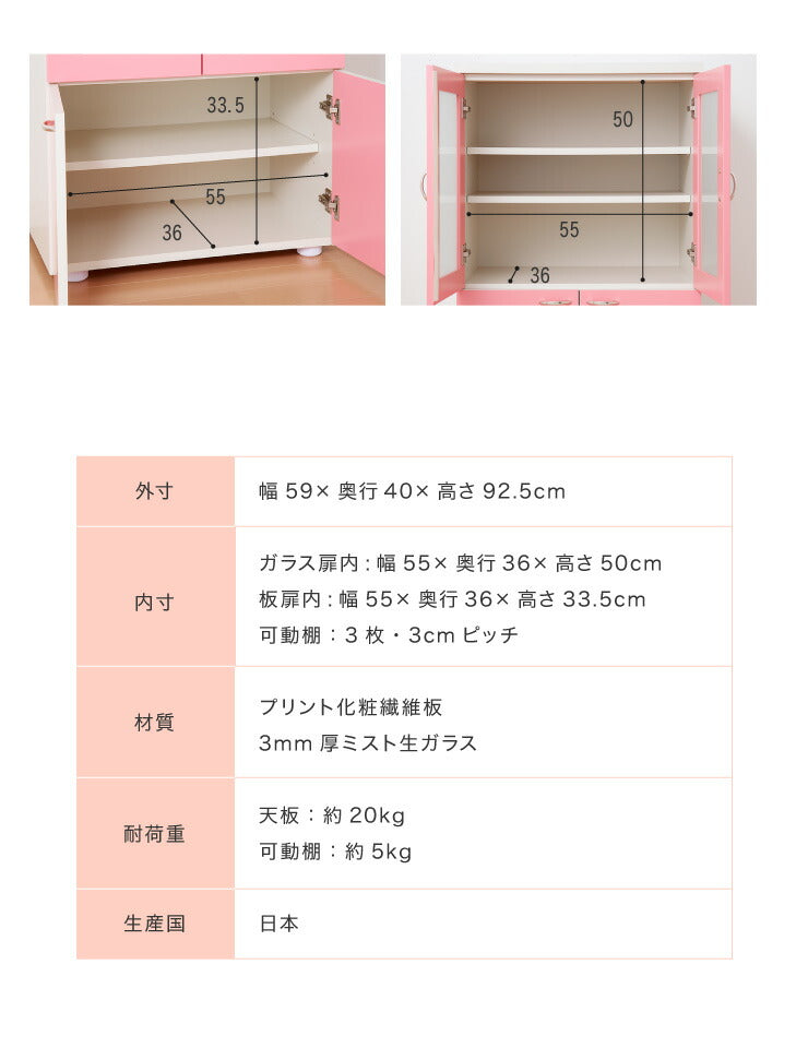 日本製 食器棚 【完成品】ロータイプ 稼働棚付き 幅60cm ガラス扉 ピンク アイボリー ミニ食器棚 キッチンボード 木製 キッチンキャビネット 台所 収納 カップボード おしゃれ 一人暮らし (代引不可)
