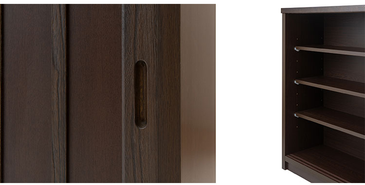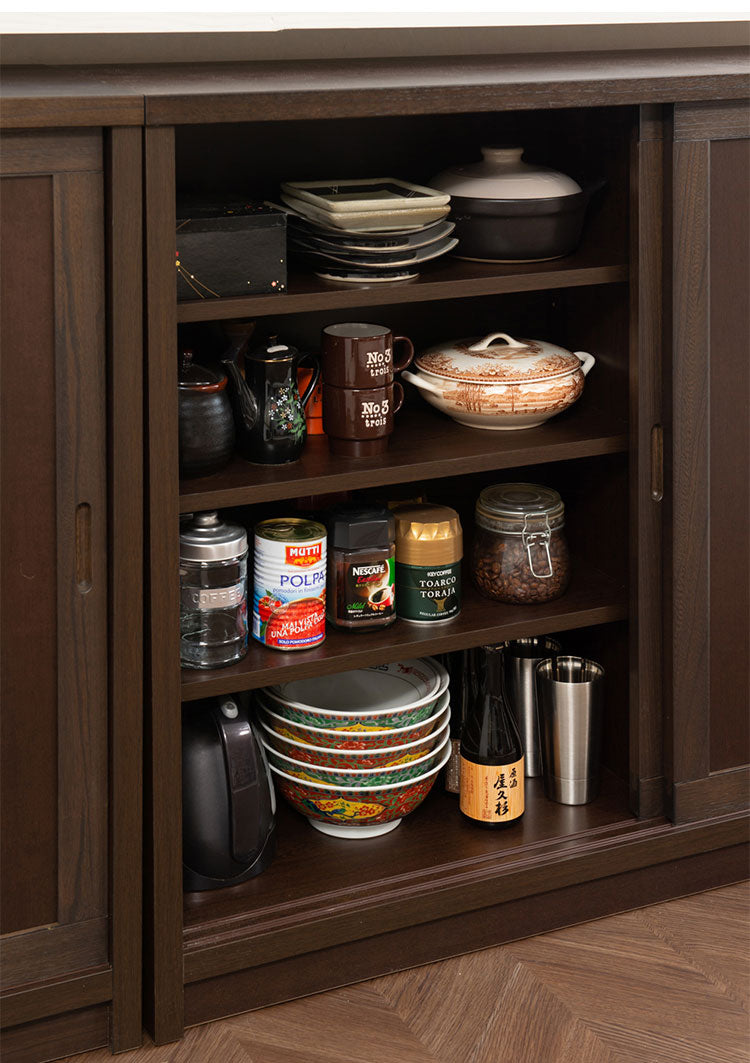 ■商品について/長く使える品質と高級感漂うデザインの【Tatis】シリーズが新登場!桐の木目を引き立たせたうづくり仕上げ、職人が組み上げた、日本製の完成品ならではの洗練されたデザインが魅力的なキッチンカウンター下収納シリーズです。和室はもちろん、洋室でも違和感なくお洒落なお部屋に演出してくれます♪2枚扉の引き戸式カウンター下収納は、すっきりとした仕上げがリビングに置いても飽きのこないデザインになっています。食器類の収納はもちろんの事、棚板の高さを変えて様々な物の収納ができます。カウンター下には案外収納する物が溢れています。CDやDVDを収納したり、アルバムや眼鏡ケースなど小物の収納にも便利です。また棚板を止める金具は特殊な金具を使い、設置すると落ちにくい構造になっています。カウンター下などデッドスペースに、造り付けのようなしっかりとした収納スペースが作れます。他のシリーズと合わせて、キッチンやリビングなどでお洒落に収納できます。