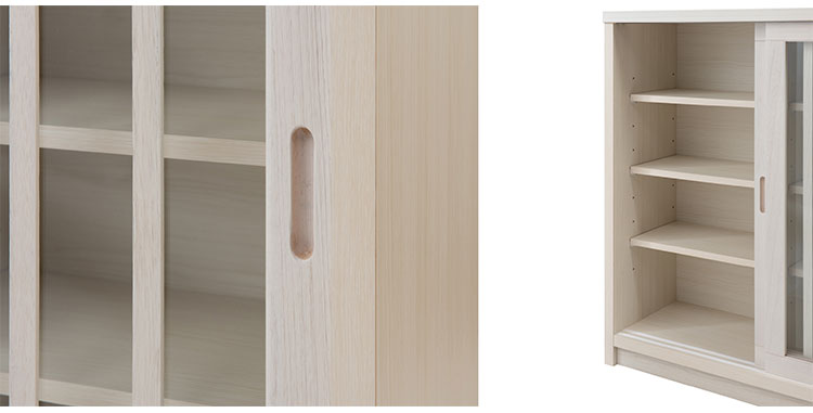 ■商品について/長く使える品質と高級感漂うデザインの【白雪】シリーズが新登場!桐の木目を引き立たせたうづくり仕上げ、職人が組み上げた、日本製の完成品ならではの洗練されたデザインが魅力的なリビングキャビネットシリーズです。和室はもちろん、洋室でも違和感なくお洒落なお部屋に演出してくれます♪2枚扉の引き戸式カウンター下収納は、すっきりとした仕上げがリビングに置いても飽きのこないデザインになっています。開き扉の商品では、開閉のために必要なスペースが扉の幅分必要になってきますが、引き戸式ならわずかなスペースでOK。取り出し易い引き戸式で前のスペースが狭くなっても、使い易くなります。また棚板の高さを変えて様々な物の収納ができます。リビングには案外収納する物が溢れています。CDやDVDを収納したり、アルバムや眼鏡ケースなど小物の収納にも便利です。また、棚板を止める金具は特殊な金具を使い、設置すると落ちにくい構造になっています。他のシリーズと合わせて、キッチンやリビングなどでお洒落に収納できます。