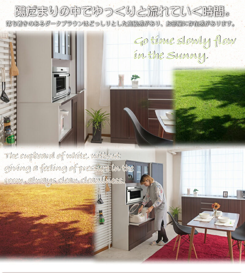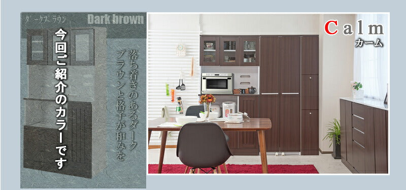 ■商品について/落ち着きのあるダークブラウンに格子の扉をあしらったカップボード。収納量と品質にもこだわり、棚板の枚数も通常の類似商品と違い上部・下部とも増量。棚板を支えるダボにはネジダボを採用。通常の差し込みのダボでは穴がきつく、一度はめると取れにくくなったり、スポッと取れて棚板が落ちる事が多々あります。ネジ式ダボはそんなストレスも解消!しっかり設置して位置変えも簡単です。