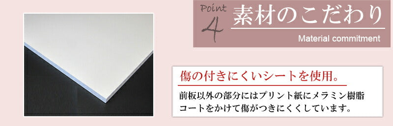 ■商品の仕様/前板:強化プリント紙化粧繊維板、天板:ハイグロス化粧繊維板、その他:プリント紙化粧繊維板(傷に強い樹脂コート加工)