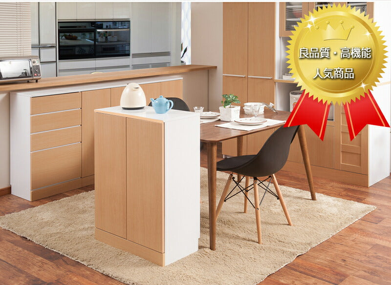 ■商品について/カウンター下のデッドスペースを造り付けの様なスッキリした収納庫で大量収納。前板にには傷に強い強化シートを使用しています。引出しタイプと幅の3種類ある扉タイプでカウンター下のスペースと収納物に合わせてお選び頂けます。スッキリと仕上げるために取っ手を使わず、プッシュ式の扉を採用。更に収納ポイントとして通常の3段の棚板よりも5段と多くし、細かく収納したり見分けがしやすいように考えられた商品です。