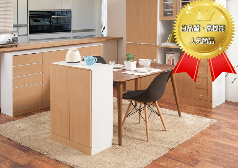 ■商品について/カウンター下のデッドスペースを造り付けの様なスッキリした収納庫で大量収納。前板には傷に強い強化シートを使用しています。引出しタイプと幅の3種類ある扉タイプでカウンター下のスペースと収納物に合わせてお選び頂けます。スッキリと仕上げるために取っ手を使わず、プッシュ式の扉を採用。更に収納ポイントとして通常の3段の棚板よりも5段と多くし、細かく収納したり見分けがしやすいように考えられた商品です。