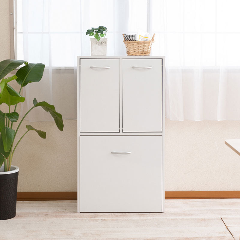 上段はフラップ式の14リットルのゴミ箱が付いた2分別、下段はワゴンタイプの24リットルの大型ゴミ箱が付いて、使い易く、しかもゴミ箱に見えないのがお洒落!裏面もシート貼りをしているので、間仕切りとしてもご使用になれます。
