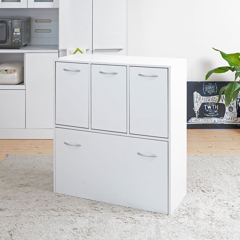 上段はフラップ式の14リットルのゴミ箱が付いた3分別、下段はワゴンタイプの24リットルの大型ゴミ箱が2個付いて、使い易く、しかもゴミ箱に見えないのがお洒落!裏面もシート貼りをしているので、間仕切りとしてもご使用になれます。