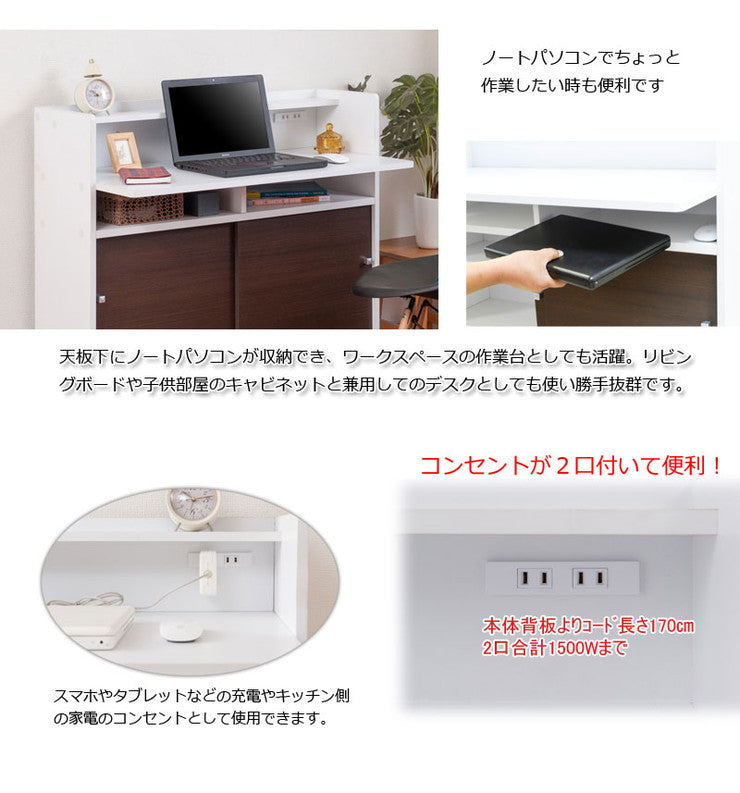 また、デスク面には2口(1500W)コンセント、デスク面下部には、ノートパソコン収納スペースを設けており、パソコン作業も十分対応できます。