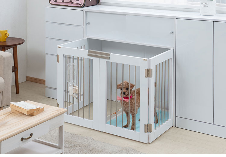 インテリア性も兼ねたペット家具「すむぺっと」×「FACE・NEAT・CALM」のスペシャルコラボ。収納も付いたドッグサークルは、愛犬をサークルに入れるときだけ広げるので、普段は収納キャビネットのように使えるのが魅力!本体の奥行は約30cmでカウンター下や窓下に置いても邪魔にならないサイズ感が使いやすさの秘密です。