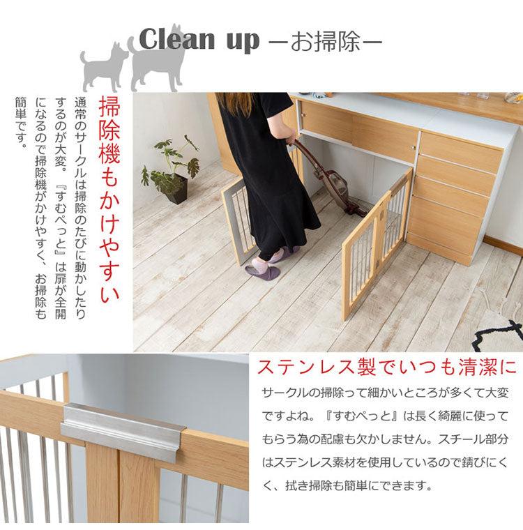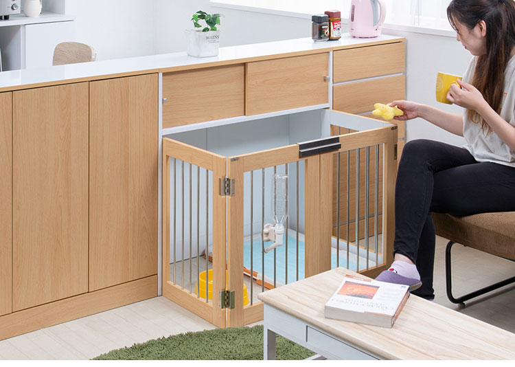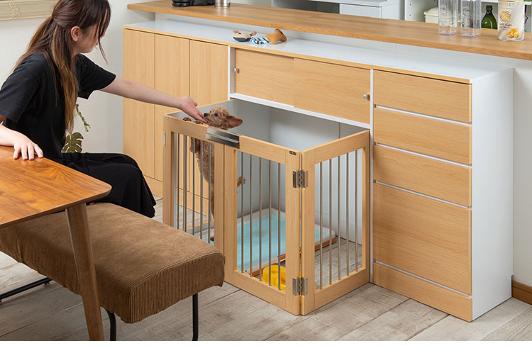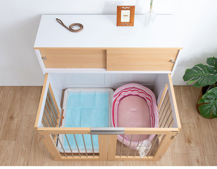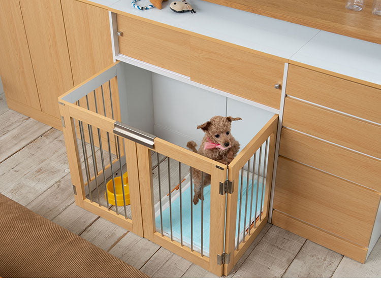 インテリア性も兼ねたペット家具「すむぺっと」×「FACE・NEAT・CALM」のスペシャルコラボ。収納も付いたドッグサークルは、愛犬をサークルに入れるときだけ広げるので、普段は収納キャビネットのように使えるのが魅力!本体の奥行は約30cmでカウンター下や窓下に置いても邪魔にならないサイズ感が使いやすさの秘密です。