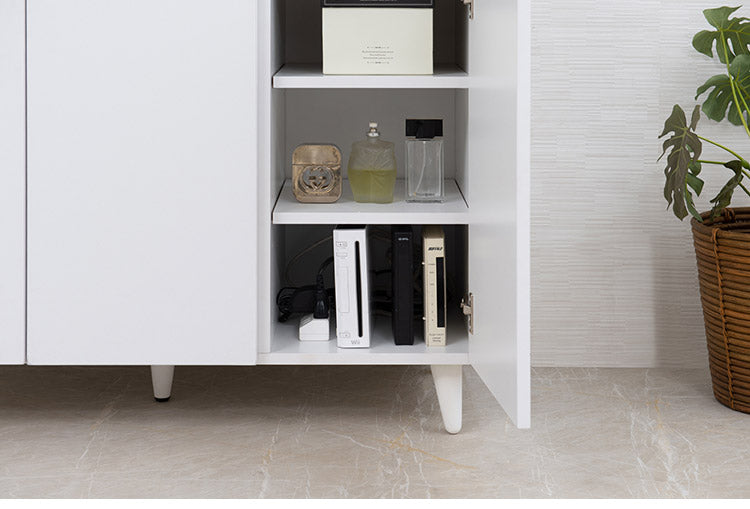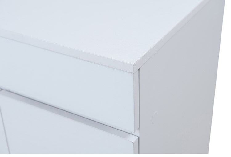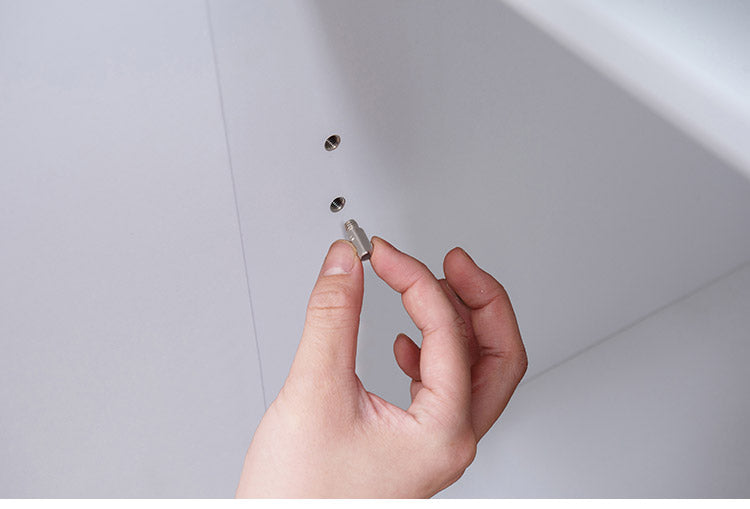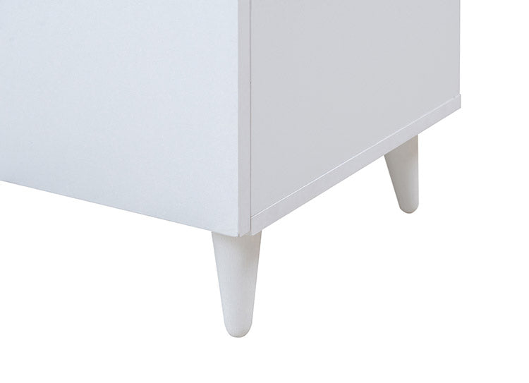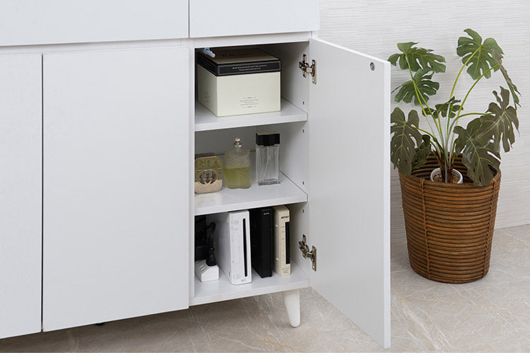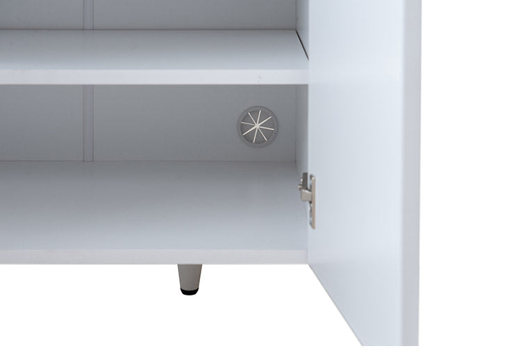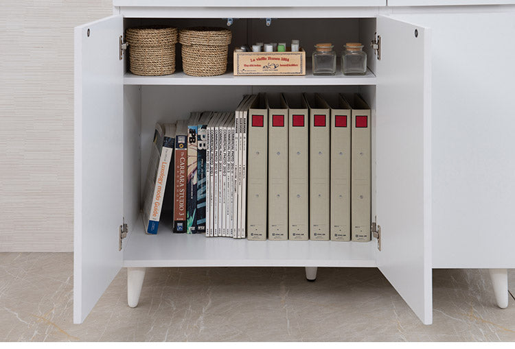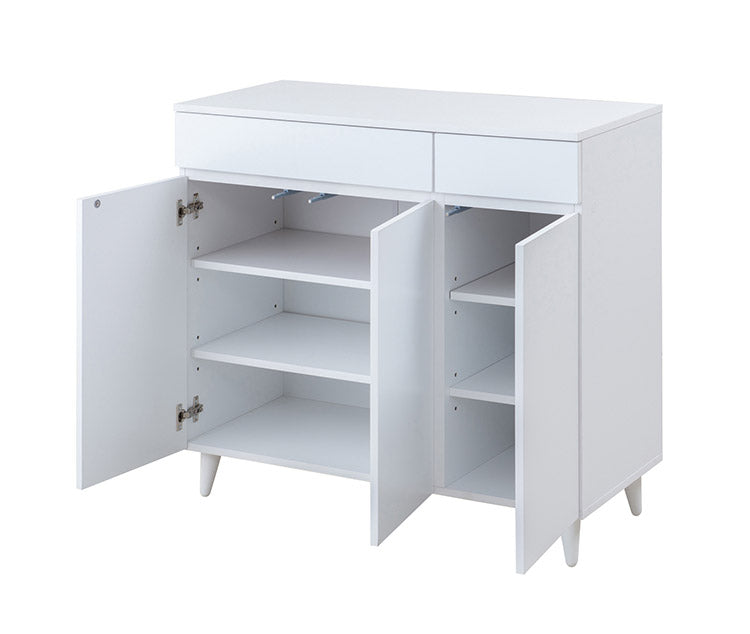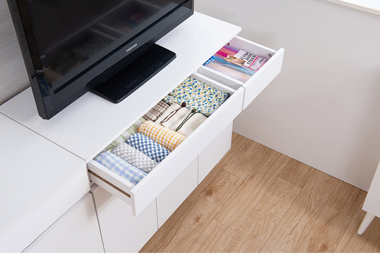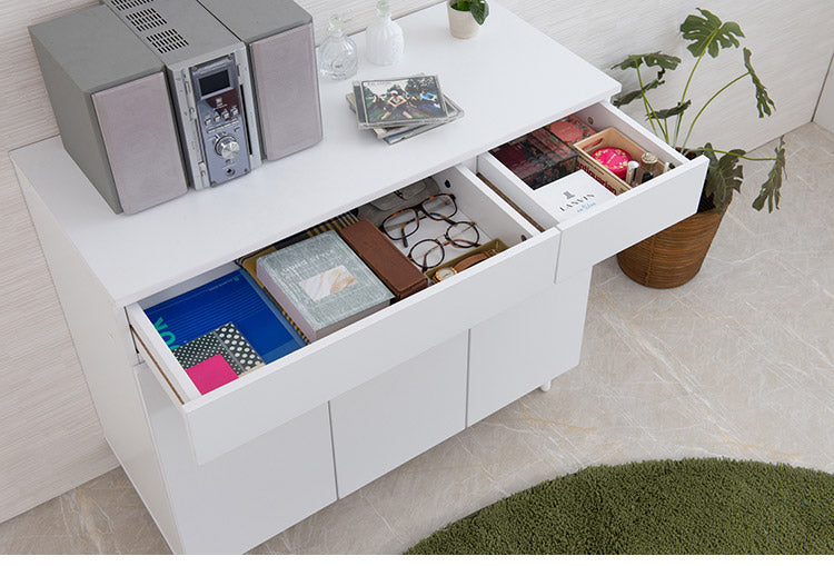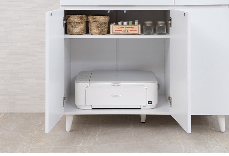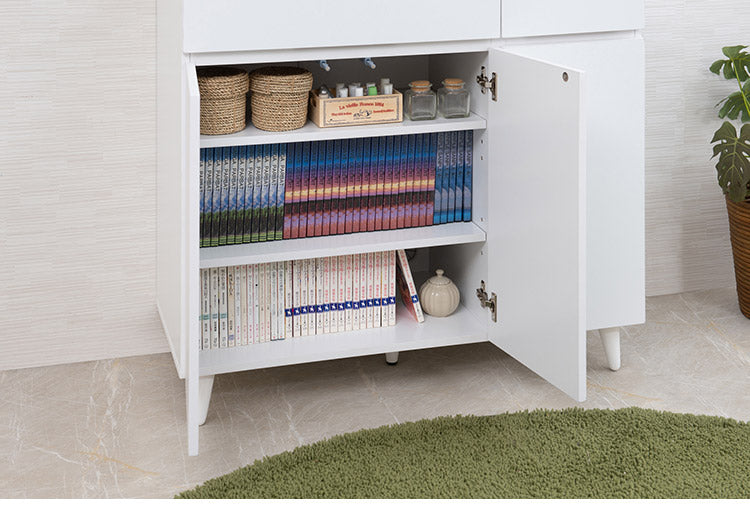 明るいホワイトカラーをベースに引出しと扉を使いやすい位置に配置したキャビネットシリーズ。引出しには、小物などのアイテムが収納できます。扉内には移動ができる棚板が2枚あり、収納する物に合わせて高さを変える事ができます。本やDVDなども収納できます。プリンターやルーターなども収納できるようにコード穴を設けています。また配線をしやすいように、棚板の後ろは1cmの隙間を設け、コードを上下で配線可能です。