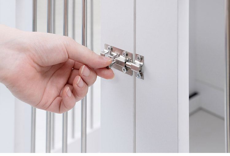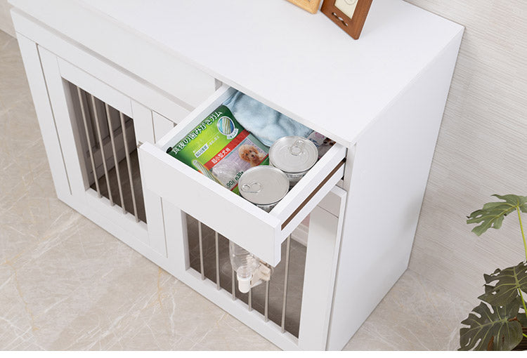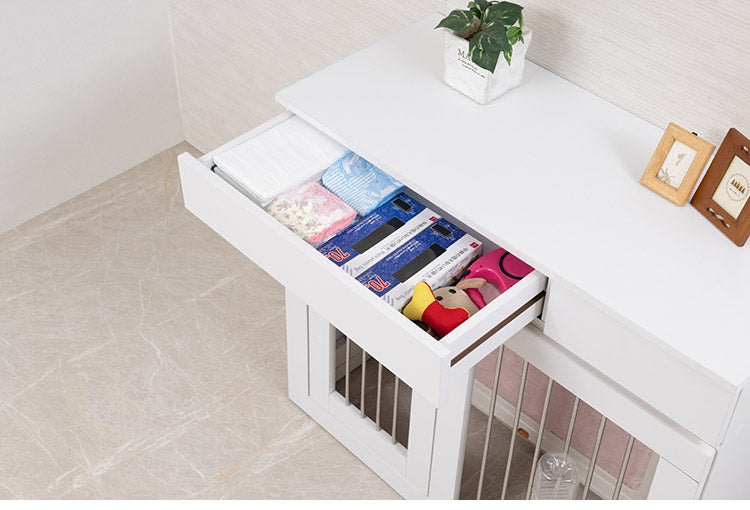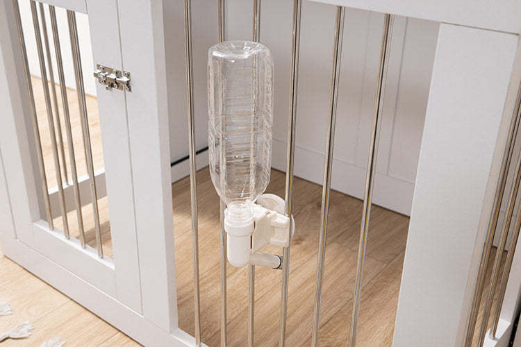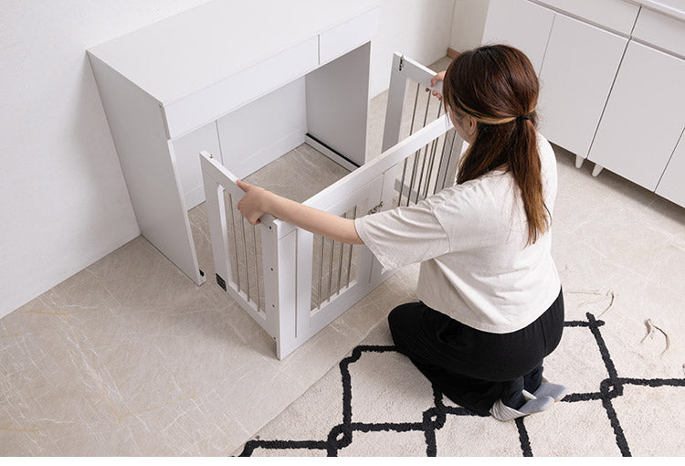 便利機能のサークル収納も付いたドッグサークルは、愛犬をサークルに入れるときだけ広げるので、普段は収納キャビネットのように使えるのが魅力。木製の温かい仕上がりもインテリアに溶け込み、お洒落なお部屋に。