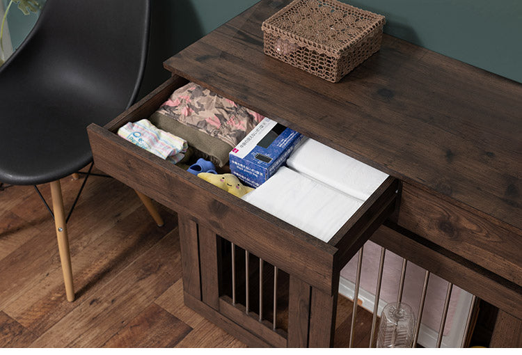 便利な機能のサークル収納も付いたドッグサークルは、愛犬をサークルに入れるときだけ広げるので、普段は収納キャビネットのように使えるのが魅力。木製の温かい仕上がりもインテリアに溶け込み、お洒落なお部屋に。ケージ部がスライド式になっているので、すごく簡単に設置でき、開閉も超簡単!閉じている時は本体の奥行は約40cmで邪魔にならず、他の家具と並べてもスッキリとします。
