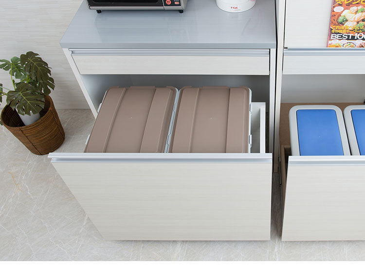 天板は、水や汚れに強い高級ピアフォルテ、引出し内部も汚れに強いクリーンイーゴスを採用。天板には埃避け安全機能完備のスライドカバー付き2口コンセント、引出しには収納部全体まで引き出せるフルオープンスライドレールを採用。また大容量の45リットルのゴミ箱は、かさばるペットボトルや缶などが大量に捨てることができます。日本製高品質&組立不要のすぐに使える完成品でお届け。