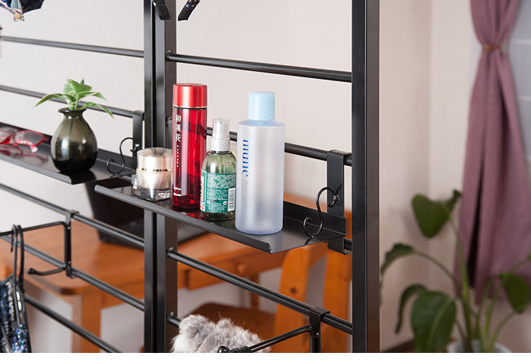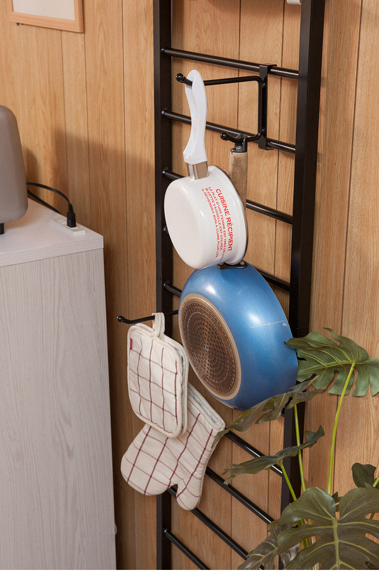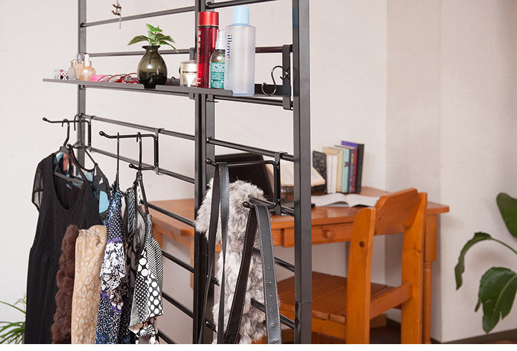 平凡なリビングに少しスパイスを効かせたミックススタイル。上下のカールな美曲線がスチールの無骨感を調和させ、木製の家具とも相性バッチリ!間仕切りや壁面使いと玄関・リビングなどあらゆるシーンにはまるカーリーパーテーション。フックや棚板など機能も万全。