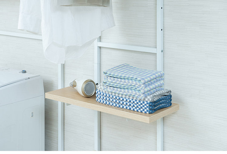 無段階に棚板の位置を調節できる突っ張りウォールシェルフ。棚板の位置を無段階に調節できるから自分の丁度いい高さにすることができます。