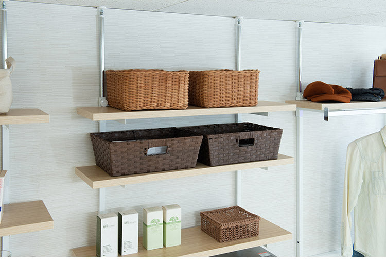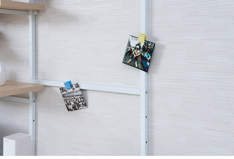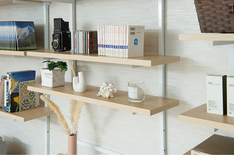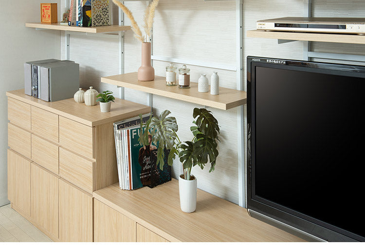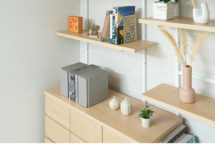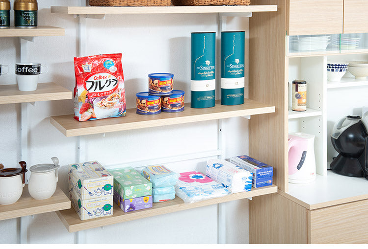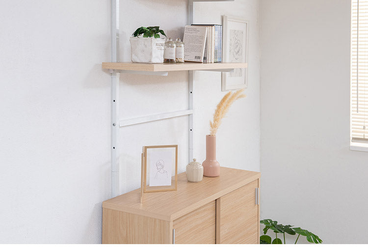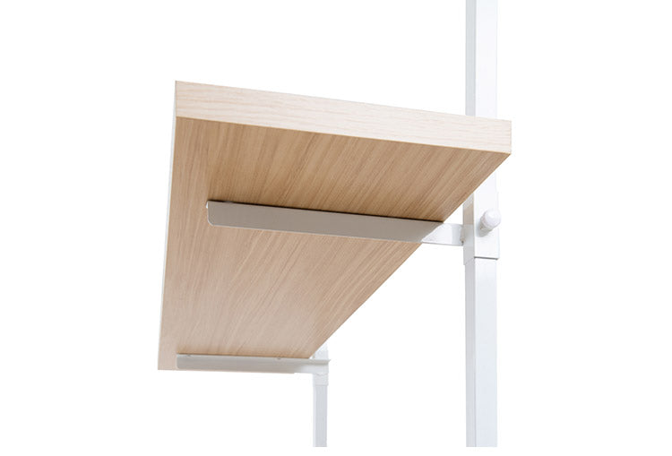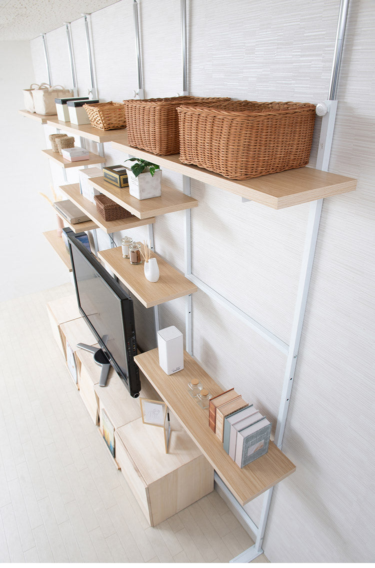 無段階に棚板の位置を調節できる突っ張りウォールシェルフ。棚板の位置を無段階に調節できるから自分の丁度いい高さにすることができます。