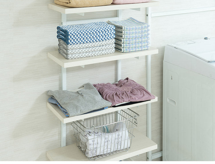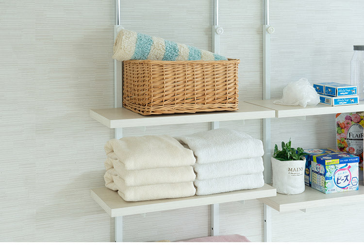 無段階に棚板の位置を調節できる突っ張りウォールシェルフ。棚板の位置を無段階に調節できるから自分の丁度いい高さにすることができます。